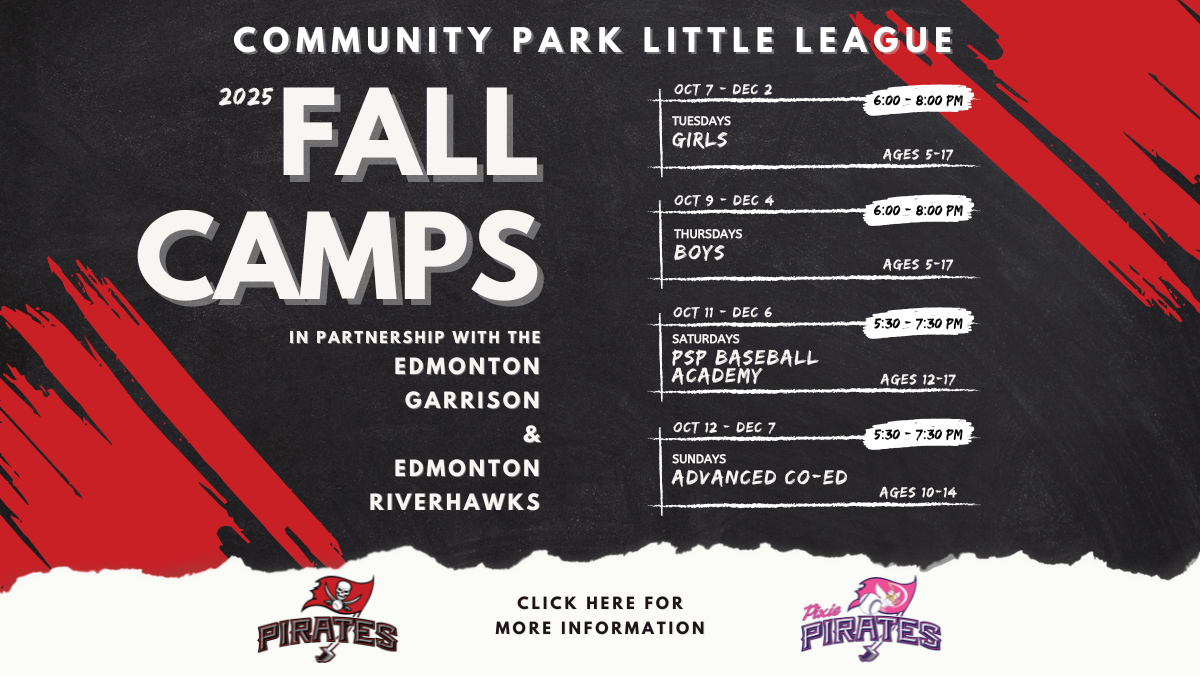 Community Park Little League has been providing affordable baseball for kids (T Ball through senior) in North Edmonton and surrounding areas for over 25 years. Join us this season to see why Community Park Little League’s Pirates Baseball is the best youth baseball league in the North Edmonton area.